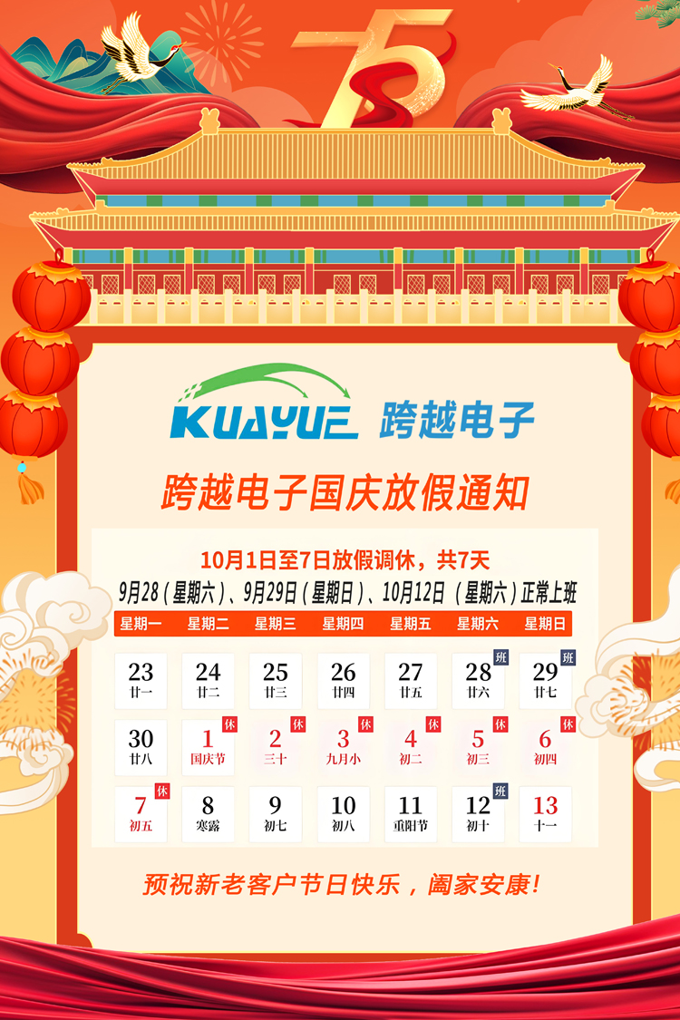 根据国家法定假日规定,并结合公司的实际情况,跨越电子2024年国庆节放假安排具体如下: