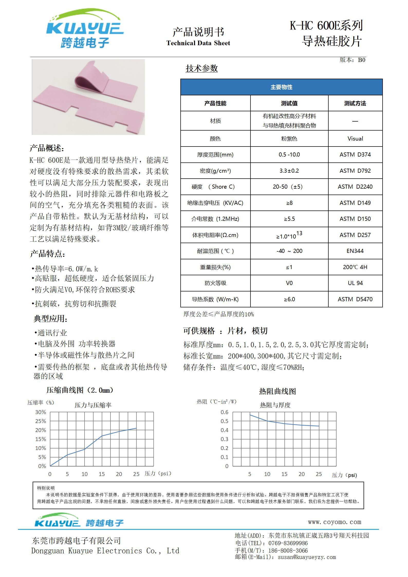 k-hc 600e是一款通用型导热垫片,能满足对硬度没有特殊要求的散热需求,其柔软性可以满足大部分压力装配要求,表现出较小的热阻,同时排除元器件和电路板之间的空气,充分填充各类粗糙的表面。该产品自带粘性。默认为无基材结构,可以定制为有基材结构,如背3m胶/玻璃纤维等工艺以满足特殊要求。