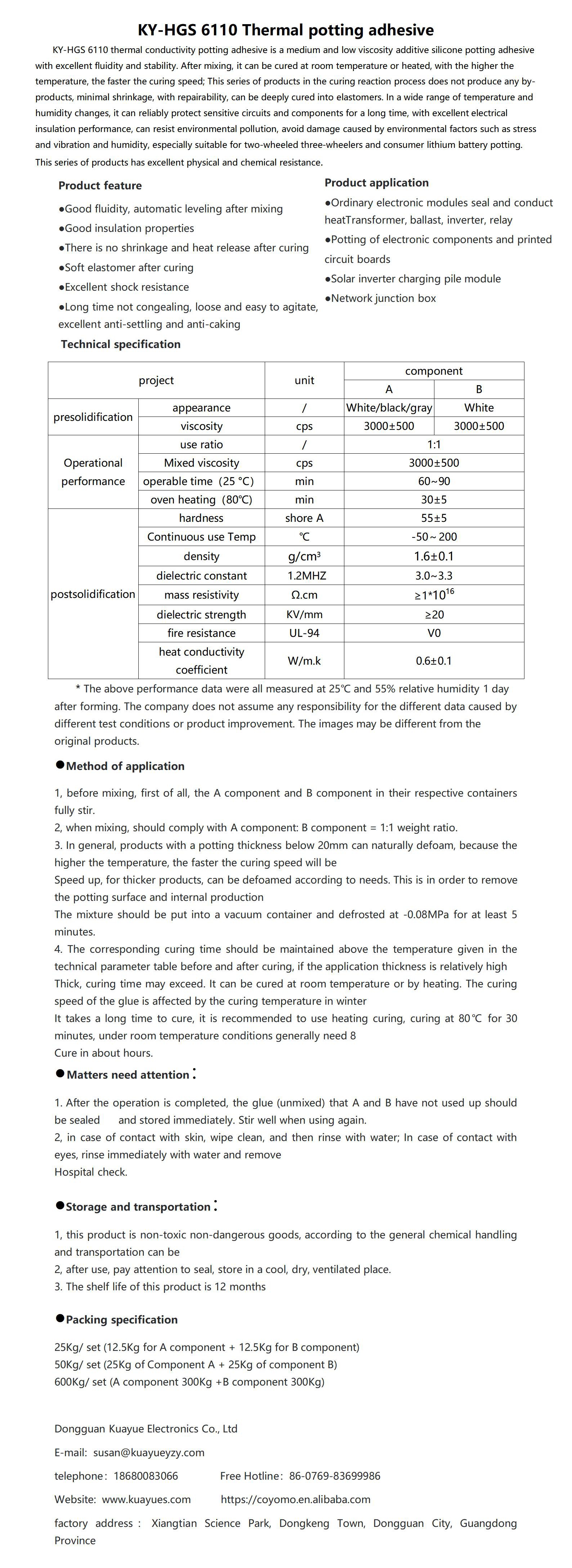 ky-hgs 6110 thermal conductivity potting adhesive is a medium and low viscosity additive silicone potting adhesive with excellent fluidity and stability. after mixing, it can be cured at room temperature or heated, with the higher the temperature, the faster the curing speed; this series of products in the curing reaction process does not produce any by-products, minimal shrinkage, with repairability, can be deeply cured into elastomers. in a wide range of temperature and humidity changes, it can reliably protect sensitive circuits and components for a long time, with excellent electrical insulation performance, can resist environmental pollution, avoid damage caused by environmental factors such as stress and vibration and humidity, especially suitable for two-wheeled three-wheelers and consumer lithium battery potting. this series of products has excellent physical and chemical resistance.