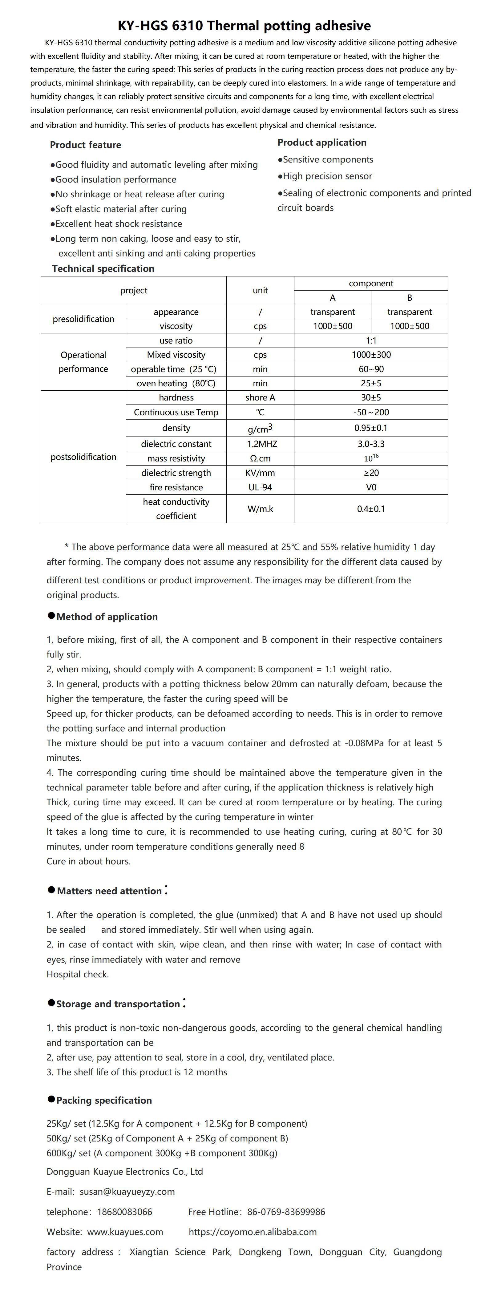 ky-hgs 6310 thermal conductivity potting adhesive is a medium and low viscosity additive silicone potting adhesive with excellent fluidity and stability. after mixing, it can be cured at room temperature or heated, with the higher the temperature, the faster the curing speed; this series of products in the curing reaction process does not produce any by-products, minimal shrinkage, with repairability, can be deeply cured into elastomers. in a wide range of temperature and humidity changes, it can reliably protect sensitive circuits and components for a long time, with excellent electrical insulation performance, can resist environmental pollution, avoid damage caused by environmental factors such as stress and vibration and humidity. this series of products has excellent physical and chemical resistance.