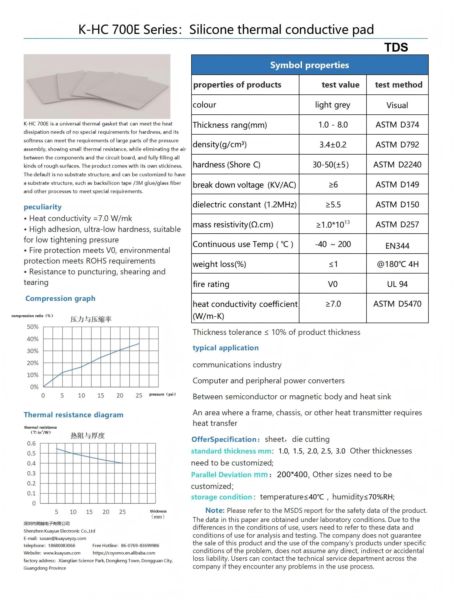 k-hc 700e is a universal thermal gasket that can meet the heat dissipation needs of no special requirements for hardness, and its softness can meet the requirements of large parts of the pressure assembly, showing small thermal resistance, while eliminating the air between the components and the circuit board, and fully filling all kinds of rough surfaces. the product comes with its own stickiness. the default is no substrate structure, and can be customized to have a substrate structure, such as backsilicon tape /3m glue/glass fiber and other processes to meet special requirements.