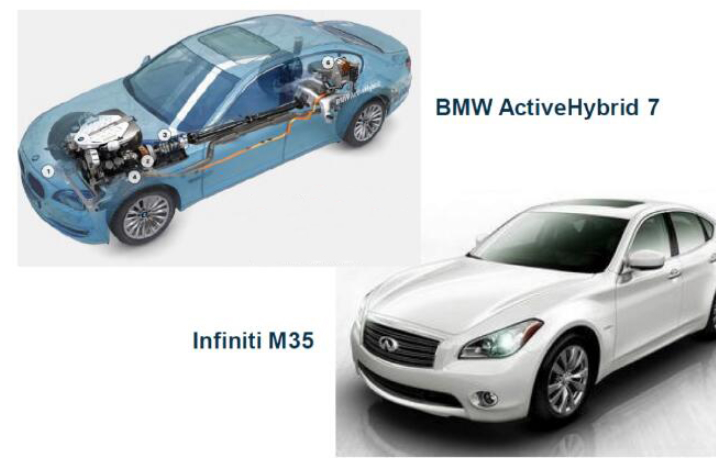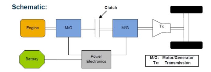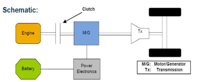 as shown in the figure, tx is the transmission of the vehicle, m/g is the motor of the vehicle, and power electronics is the inverter of the vehicle, which is used to convert the voltage between the battery and the motor. the engine and motor are separated by a clutch. that is to say, the power source of the vehicle can be provided by both the engine and the electric motor, or it can be provided solely by the electric motor or solely by the engine. for example, the previous bmw 7 series and infiniti m35 used this technology.