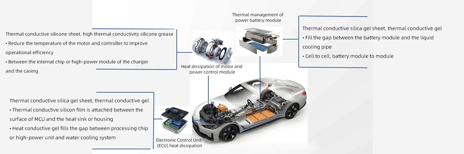 battery pack: fill the gap between the cells, improve heat conduction efficiency, and enhance battery life; at the same time, it has insulation properties to prevent strong voltage from damaging the battery system.