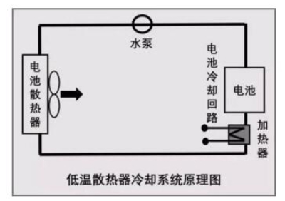 低温散热器冷却系统是电池的一个单独系统,由散热器、水泵和加热器组成。该冷却系统具有系统简单、成本低、低温环境下经济节能等优点。但是此系统有着冷却性能低、夏天水温高、应用受天气限制等缺点。