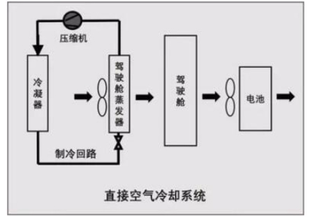 直冷系统具有系统紧凑、重量轻以及性能好的优点。但是此系统是一个双蒸发器系统、系统没有电池制热、没有冷凝水保护、制冷剂温度不易控制且制冷剂系统寿命短。