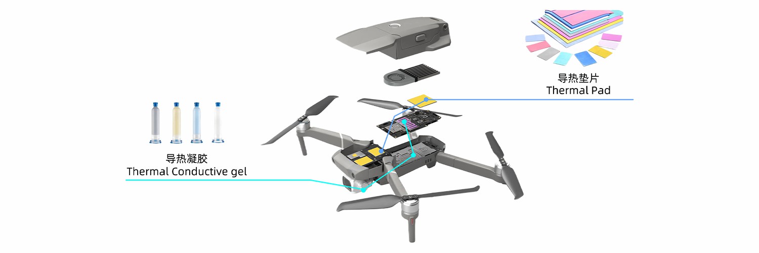 导热凝胶/硅脂:填充芯片与散热器间隙,导热系数1-12w/m·k,适应0.1-5mm公差环境。例如,无人机电调主板芯片通过“芯片-导热凝胶-屏蔽罩-导热凝胶-外壳”路径实现热量传导,热阻<0.1℃·cm²/w。